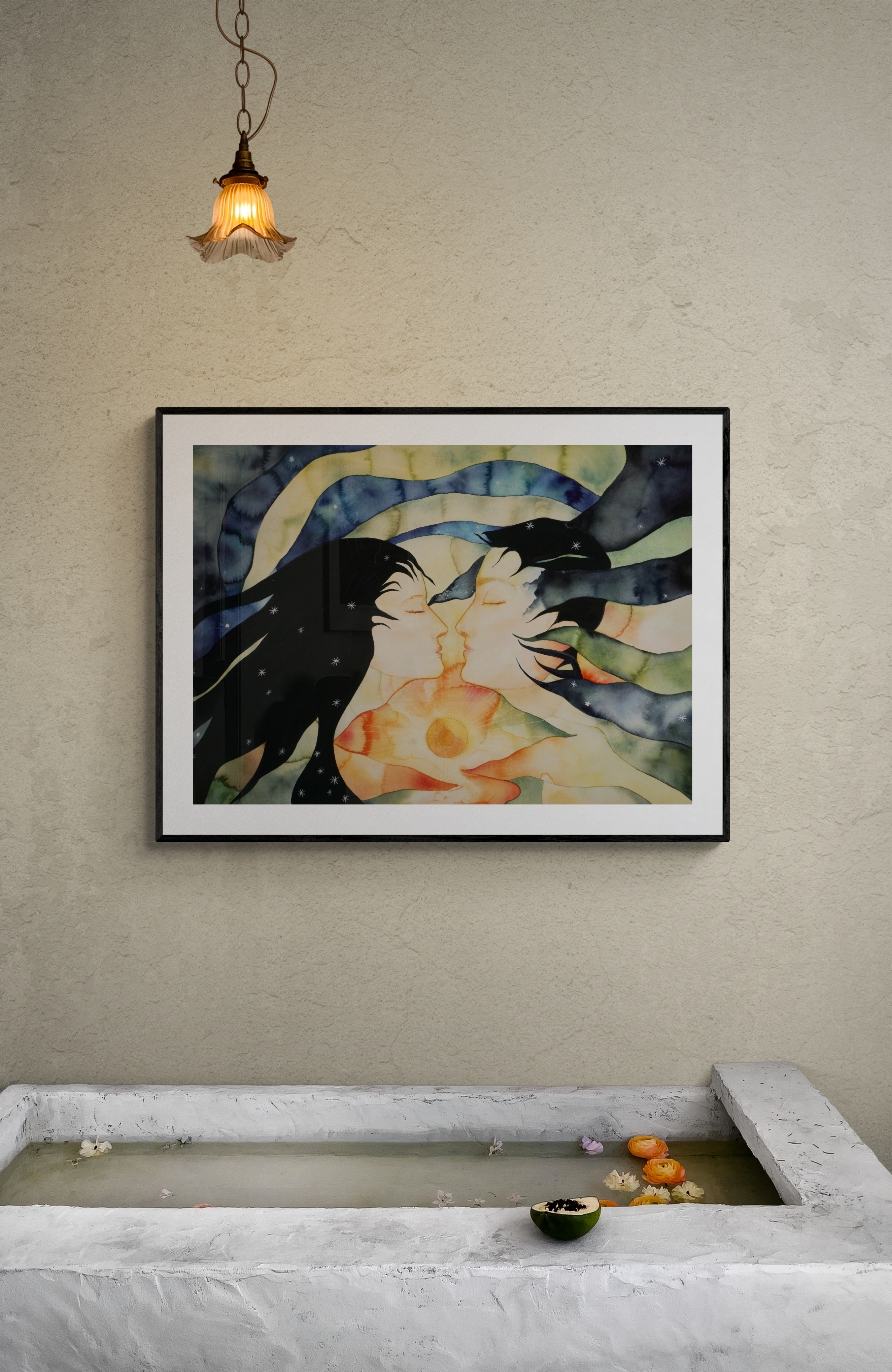 The tension in the painting awakes the trials inherent in this process: love demands transformation, a passage through shadow. Only by experiencing and enduring uncertainty does the alchemical shift occur. The ego is shed, the former identity transcended. What remains is a radical presence of being: a complete surrender to connection. Devotion does not end, but begins. It gestures toward the immortal union in which love becomes one’s own nature, and devotion is no longer risk, but homecoming. The work points to the fruit of true devotion, not fulfillment in another, but the flowering of one’s own inner self:
