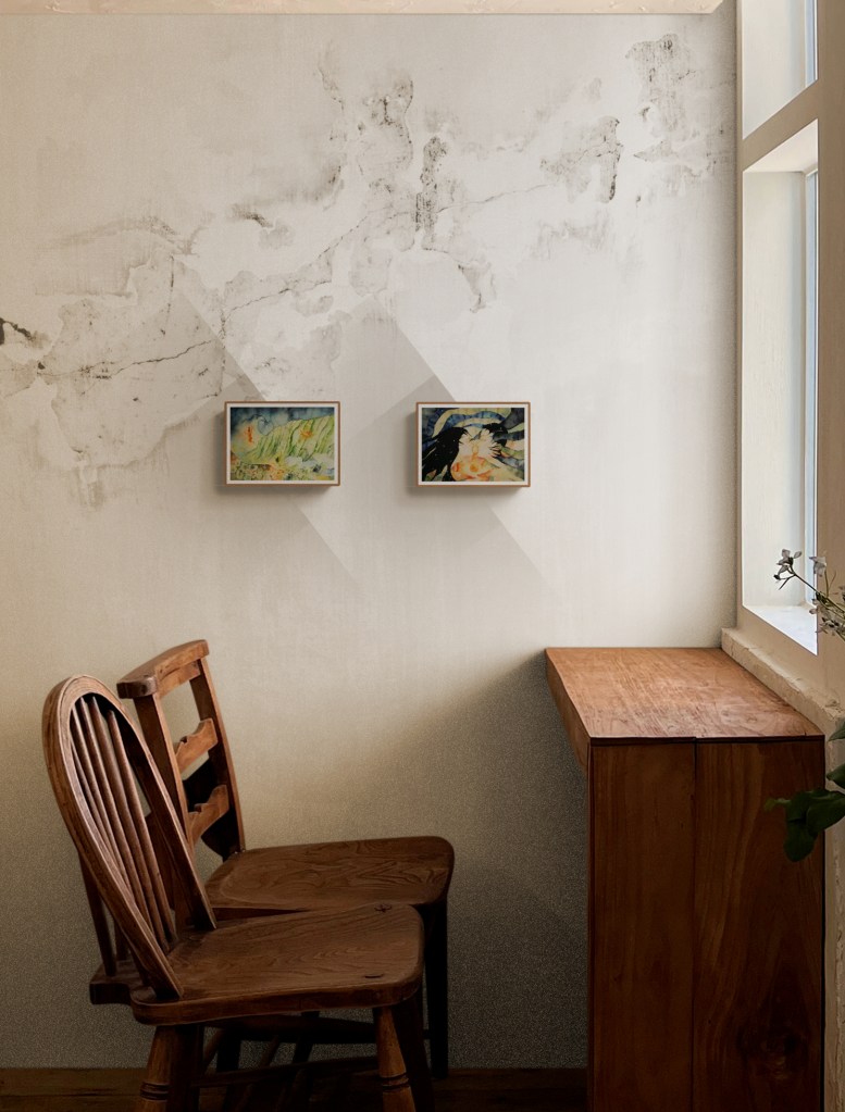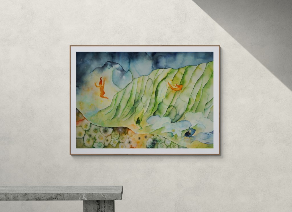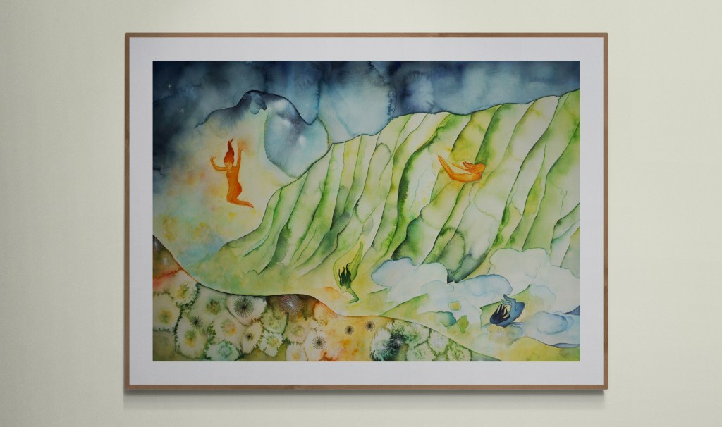 this painting draws from that union of the spiritual and the scientific, the visible layers of earth and the invisible layers of story. the figures in the work arise as embodiments of forces that shape kalalau: weather patterns, ancestral presence, geological time and the emotional impact og standing in a place that feels older than memory. the vibrant colors are not merely decorative but symbolic frequencies.