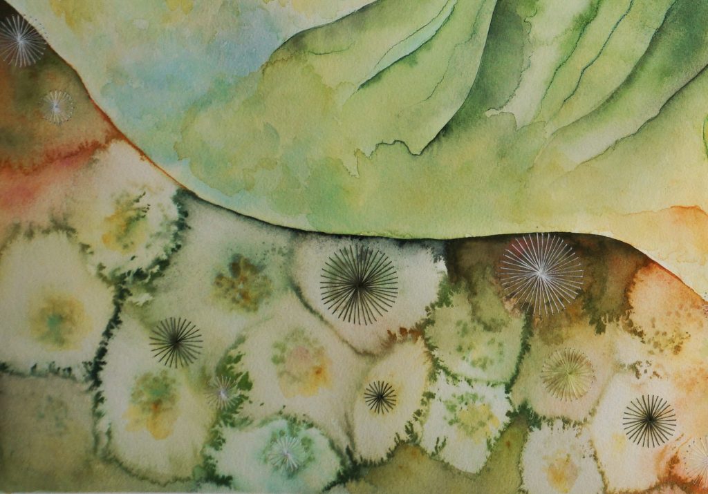 one of the most remote and revered valleys on earth, kalalau valley on the na pali coast of kauai. the painting emerges from the sensation that kalalau is watched over gently and silently, by the guardians whose forms reveal themselves in color, movement, and atmosphere.