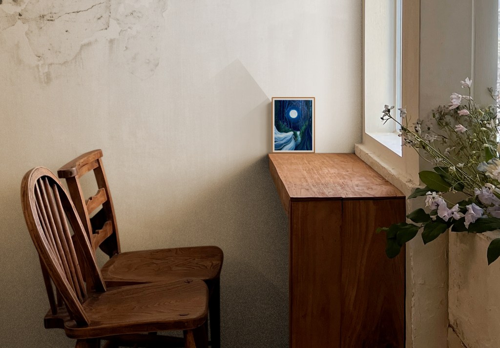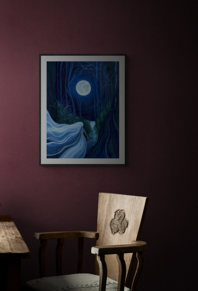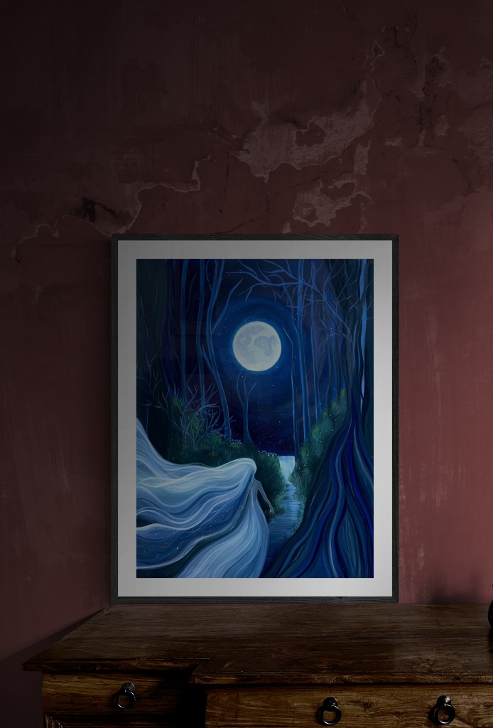 in woodland, a quiet dreamscape unfolds, a place where time dissolves. a woman walks through the night, guided by the light of the moon that drifts over water and moves the tides of life itself.a woman walks through the night, guided by the light of the moon that drifts over water and moves the tides of life itself. everything flows, light and shadow, dream and memory, becoming and fading.the deep blues breathe through the painting like pulses of the soul, they speak of depth, of motion, of a quiet trust in the eternal current of being.the forest, barely tangible, becomes a mirror of inner worlds. the water carries not only light but also dreams, fragments of what was and what is yet to come.woodland is a meditation on the river of life, on the subtle thread that connects heaven and earth, the seen and the unseen. here, time loses its meaning; only transformation remains.